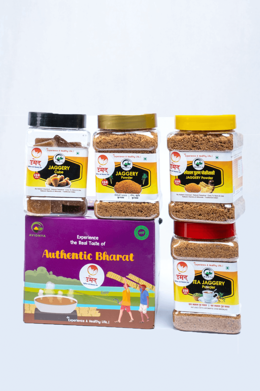 This combo pack includes Tea Jaggery, Gul Candy, Regular Jaggery, and Puranpoli Powder. A complete healthy gift for your loved ones.