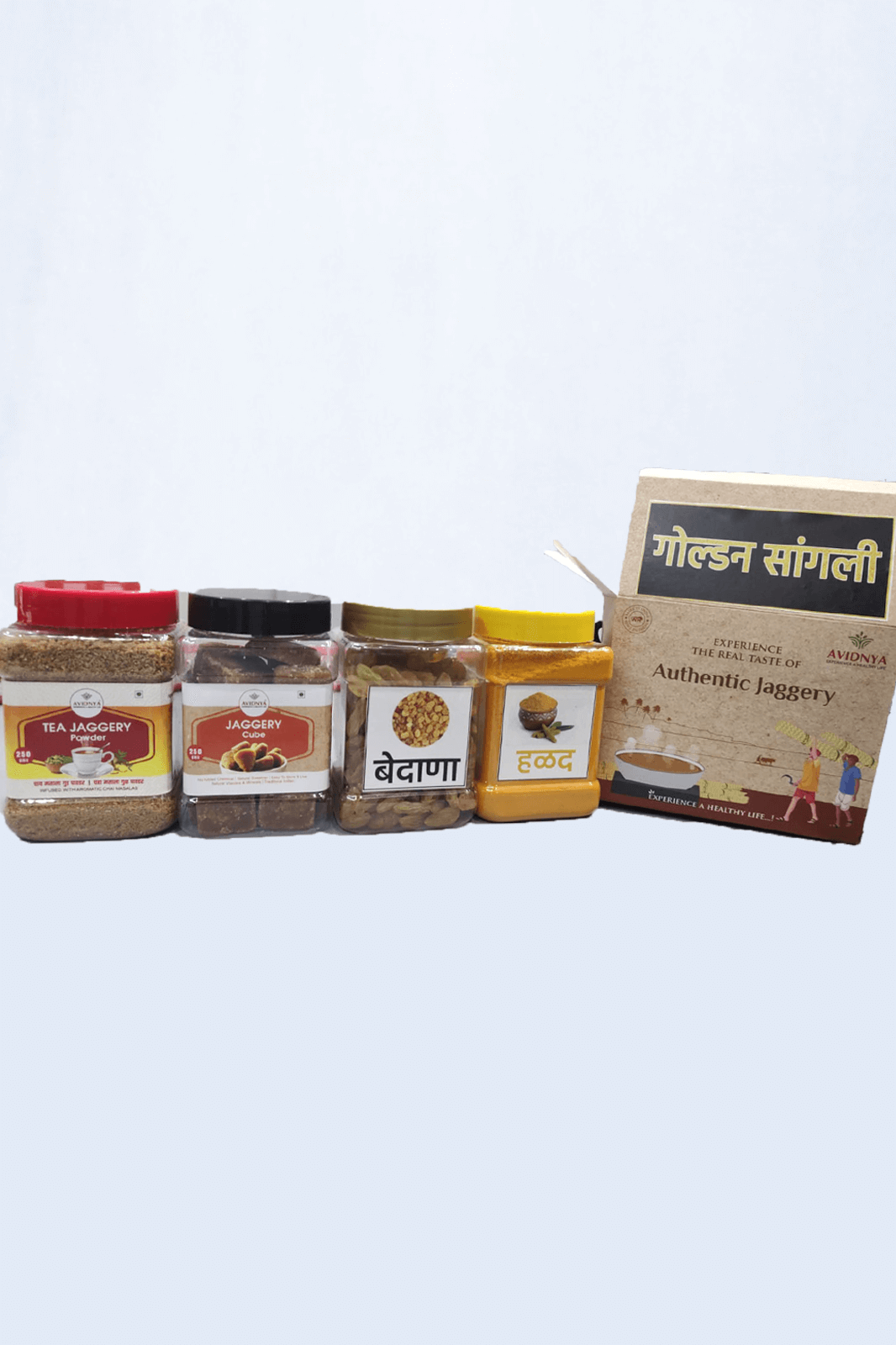 A luxury gift box that includes Tea Jaggery, Regular Jaggery, Turmeric, and Premium Raisins. Crafted for festivals, family celebrations, and premium gifting.